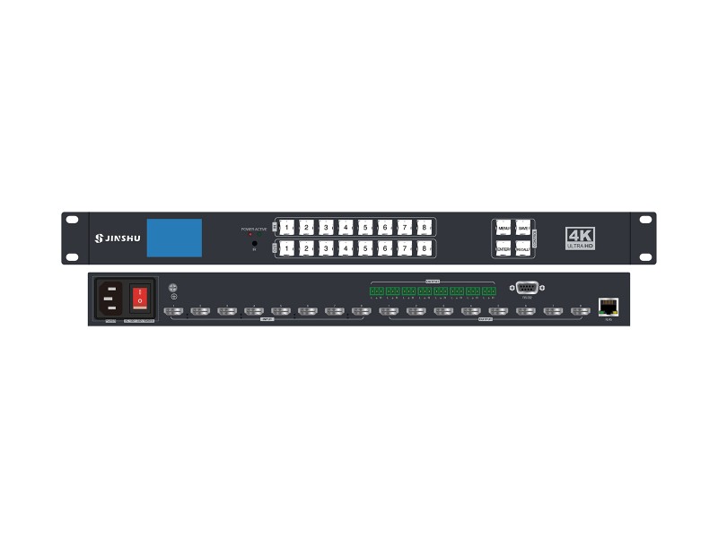 固化式高清矩阵,8路HDMI信号输入,8路HDMI信号输出;分辨率可达3840x2160@60Hz;可前面板按键控制、RS-232、网络控制。